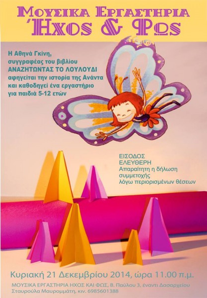 21.12.2014 - Η συγγραφέας Αθηνά Γκίνη μας παρουσίασε το παραμύθι της "Αναζητώντας το Λουλούδι", γιορτάζοντας μαζί μας τον πρώτο μας χρόνο λειτουργίας. Ένα εργαστήρι όπου η μουσική και η ζωγραφική πλαισίωσαν την γιόγκα για παιδιά, δίνοντάς τους την ευκαιρία να βιώσουν με πολλούς τρόπους την δραματοποίησή του.