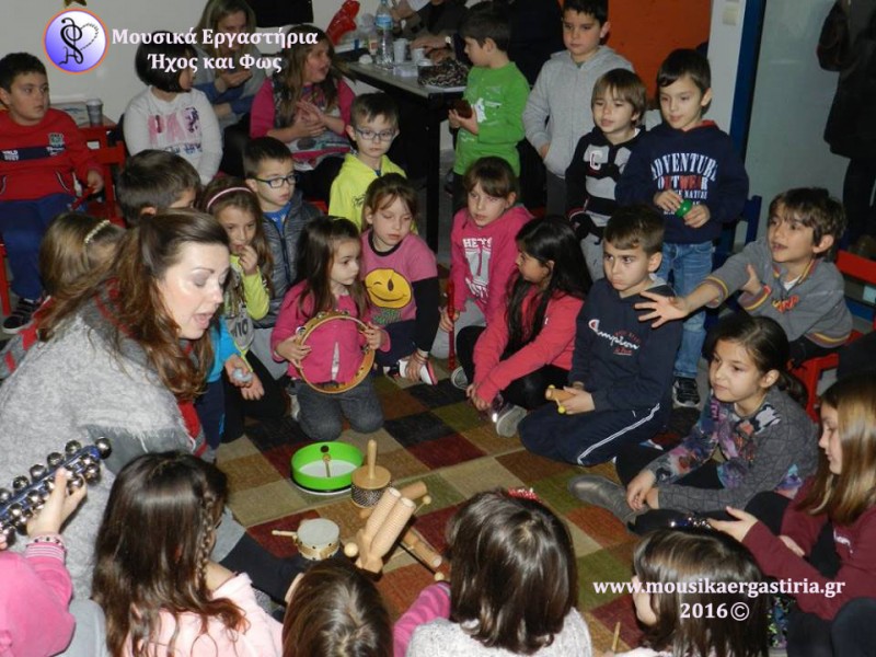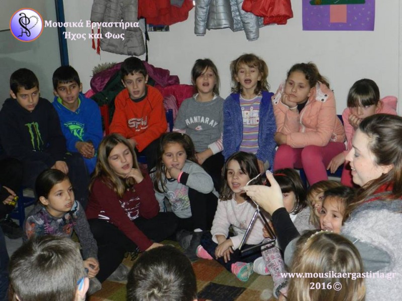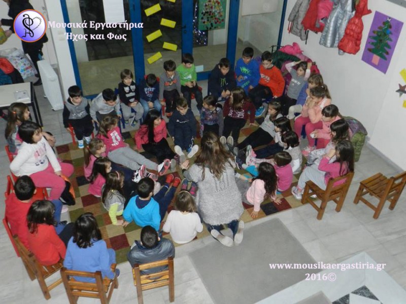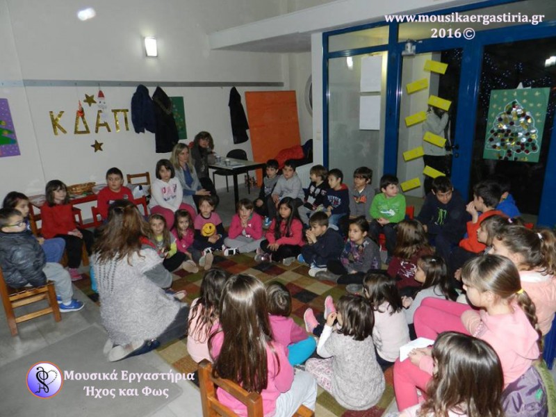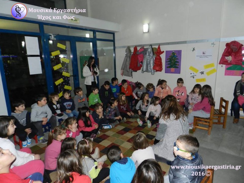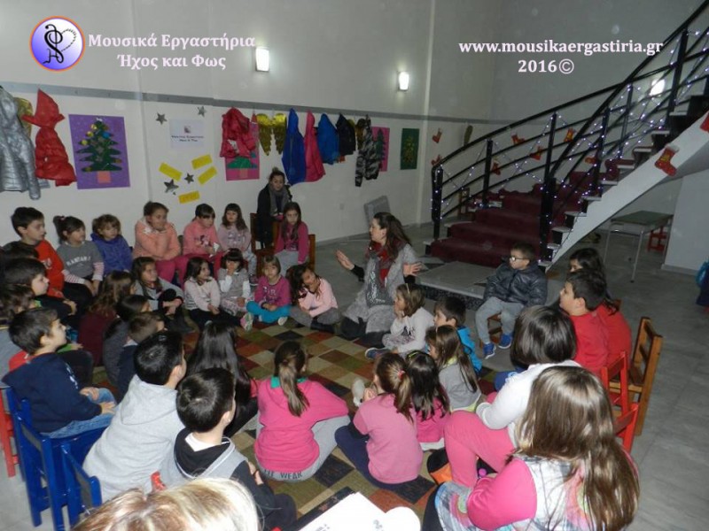 Στα πλαίσια των χριστουγεννιάτικων εκδηλώσεων που διοργάνωσε ο Δήμος Αλμυρού, φιλοξενηθήκαμε στην είσοδο του Δημαρχείου το απόγευμα της Πέμπτης 17 Δεκεμβρίου 2015. Ζεστά χαμόγελα, φωτεινά προσωπάκια γεμάτα περιέργεια και ενθουσιασμένες φωνούλες, γέμισαν τον χώρο. Μαζί με τα παιδιά, εξερευνήσαμε διάφορα ρυθμικά σχήματα και συντονιστήκαμε παίζοντάς τα. Στη συνέχεια πειραματιστήκαμε με τα μουσικά όργανα, δημιουργήσαμε τους δικούς μας ήχους, και τους ενσωματώσαμε στο παραμύθι μας. Με τη δύναμη της φαντασίας μας ζωντανέψαμε την ιστορία, δίνοντας ζωή με τη δύναμη του ήχου στους ήρωες, στα ζώα και στη φύση. Φυσικά, δεν γινόταν να κλείσουμε το εργαστήρι μας χωρίς να τραγουδήσουμε!